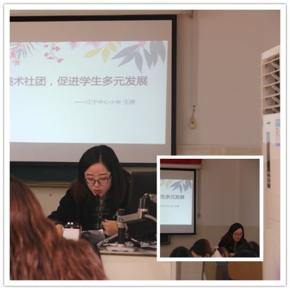 紧接着,江宁中心小学的王婷老师围绕着《绘彩美术社团,促进学生多元发展》的主题展开讲座。讲座充分围绕江宁中心小学的美术社团,让学生通过美术社团活动,使学生进行个性化、创造性的学习,让孩子们的美术特长得到更好的发展,更好的培养学生的观察能力和创新思维能力。